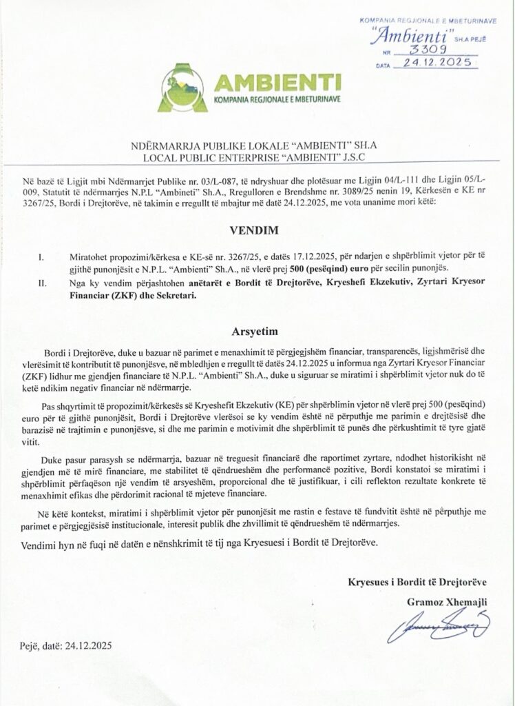 Është nënshkruar vendimi nga Kryetari i Bordit, ing. Gramoz Xhemajli, për 500 euro shpërblim vjetor për çdo punonjës të Ndërmarrjes Ambienti Sh.A., me rastin e festave të fundvitit, si dhe ngritje page për vitin 2026.